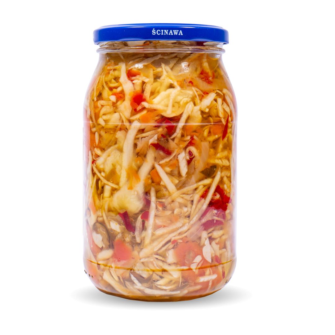 Składniki: warzywa 50% (kapusta biała 18%, marchew 10%, papryka czerwona 9%, cebula 9%, ogórki kwaszone 9%, ), woda, cukier, sól, ocet spirytusowy, olej roślinny (rzepakowy), mieszanka przypraw.