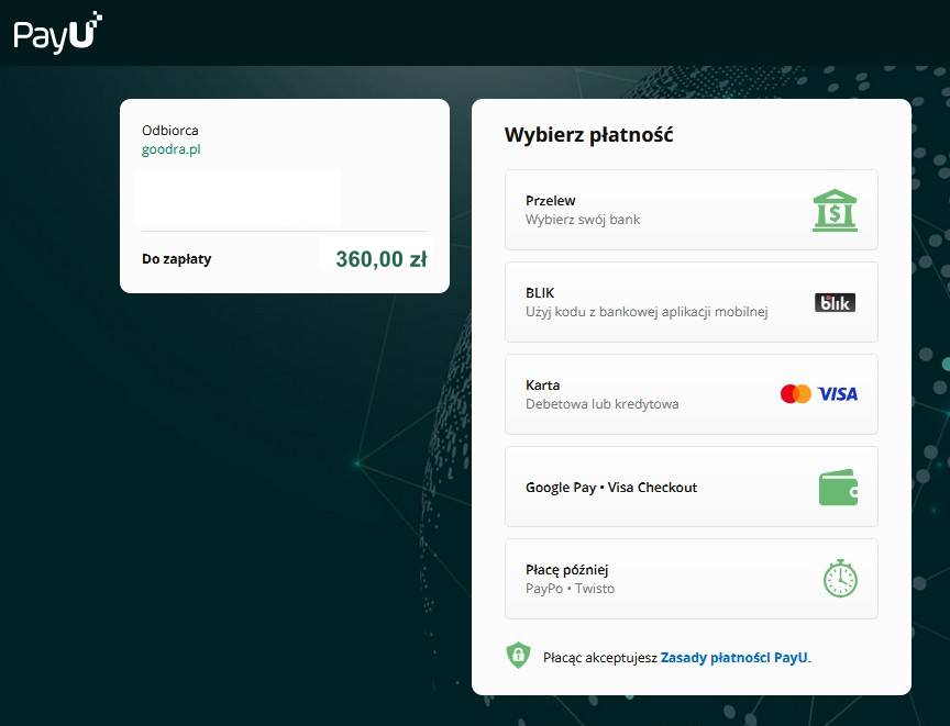 Skorzystaj z szybkiego przelewu internetowego obsługiwanego przez Twój bank. PayU współpracuje z większością banków w Polsce, co umożliwia natychmiastową realizację płatności. - Portfele elektroniczne (Google Pay, Apple Pay)